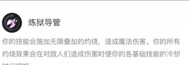 炼狱导管:你的技能会施加无限叠加的灼烧,造成魔法伤害。你的所有灼烧效果会在对敌人们造成伤害时使你的各基础技能的冷却时间缩短。
