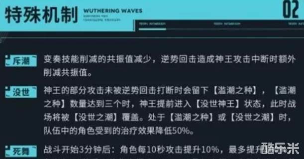 没世:神王的部分攻击未被逆势回击打断时会留下【滥潮之种】,当数量达到三个时,神王将进入【没世神王】状态,此时战场将被【没世之潮】覆盖,处于该状态下,队伍中的角色受到的治疗效果降低50%。