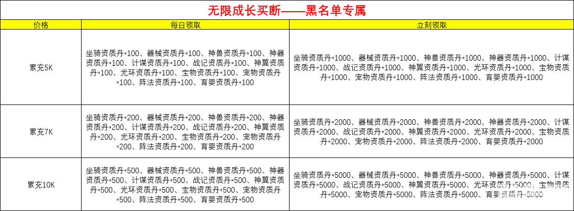 代金券*300000、1000元充值额度*∞、高级神翼自选箱*200、顶级宠物自选*999、宠物升星丹*∞、宠物口粮*∞、进阶丹*59999、进阶精华*400、装备随机箱*500、精炼石*9999、神翼淬炼丹*150000、神翼突破丹*5000、阵法属性丹*200、神翼属性丹*200、光环属性丹*200
