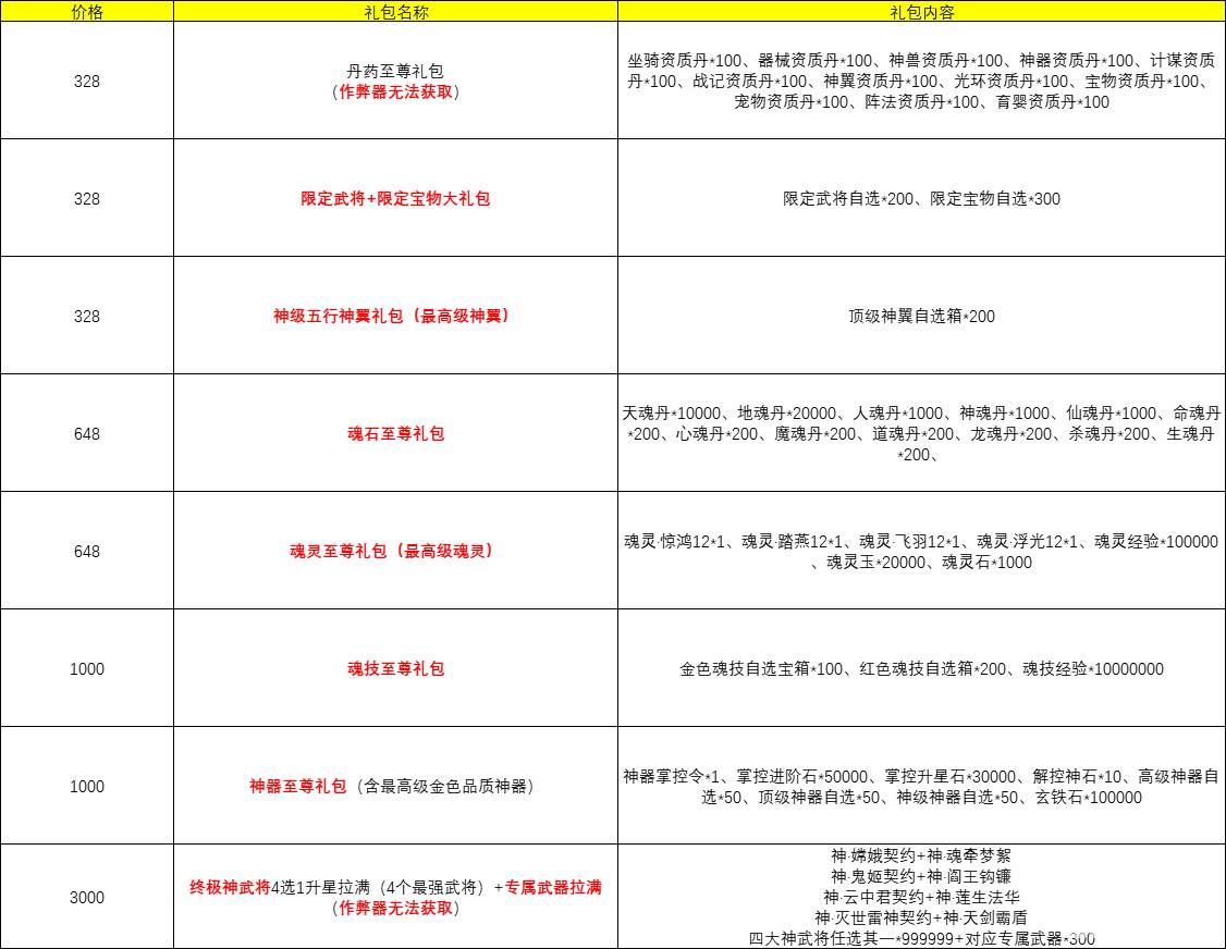 金色战技*∞、战技宝典*∞、中级神兽自选*999、高级神兽自选*999、顶级神兽自选*999、培养丹*99999、称号自选箱子*11、高级称号自选*9、顶级称号自选*9、神级攻血*10、神级双防*10、神级物血*10、神级法血*10、神级双减*10、战魂经验*∞、战魂精华*∞、神级神兽自选*999、神器属性丹*200、计谋属性丹*200、战记属性丹*200、觉醒丹*50000、觉醒宝玉*10000、伙伴之心*500