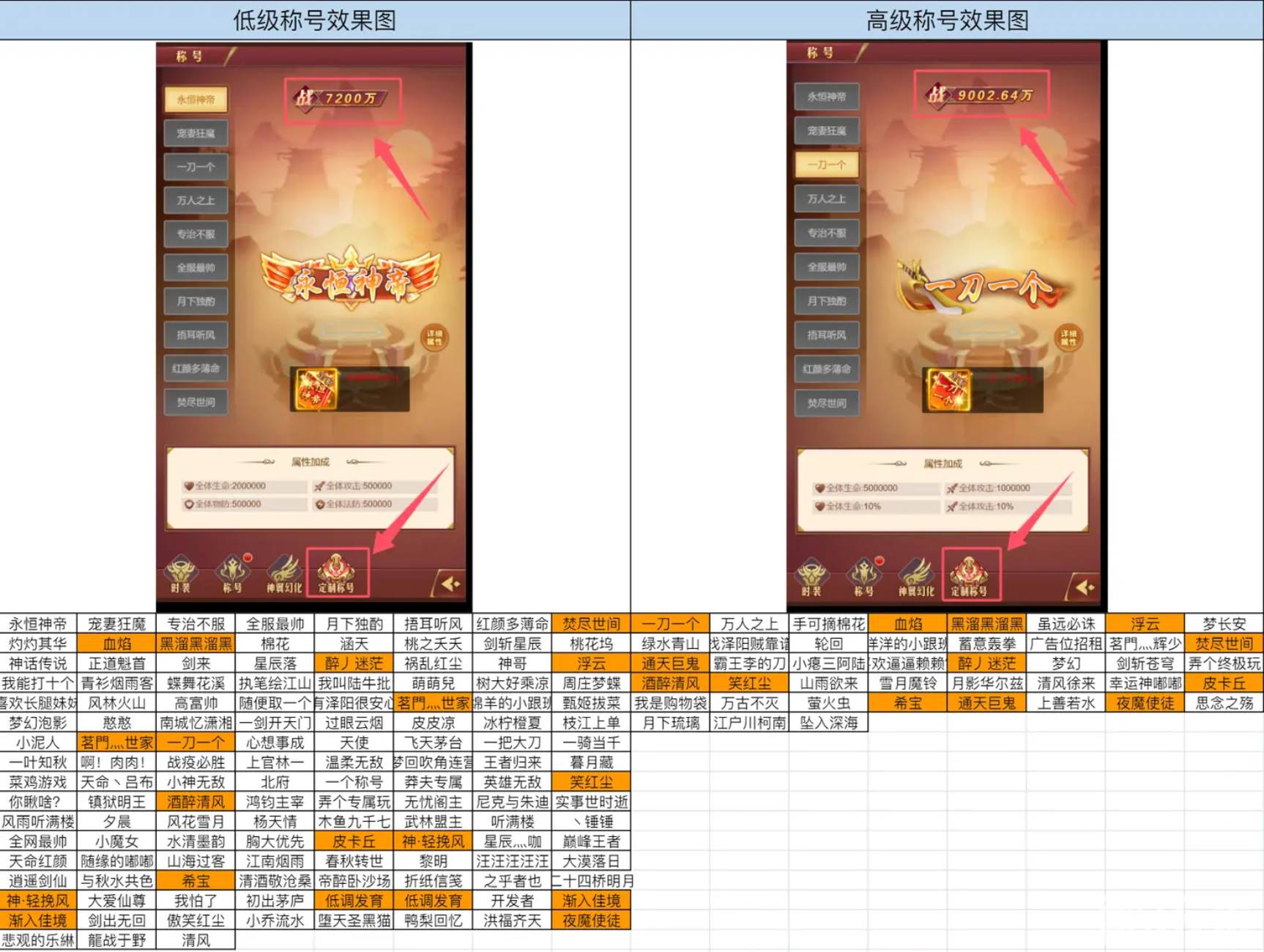 ②称号名字及外观自由定制,由玩家提供名字及外观模板。称号描述显示玩家的名字跟区服,属性固定为高级称号(百分比战力,战力越高加成越高)