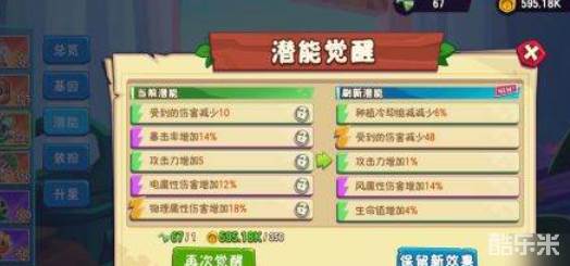 2、在潜能界面,点击右下角的“潜能觉醒”按钮,会刷新植物的潜能属性,有不同等级(颜色)属性区分,大家可以根据刷新的潜能属性数值的高低进行保留。每次潜能觉醒需要消耗“潜能药剂”和金币,如果锁定某个潜能不觉醒,还需要消耗“潜能锁定剂”;