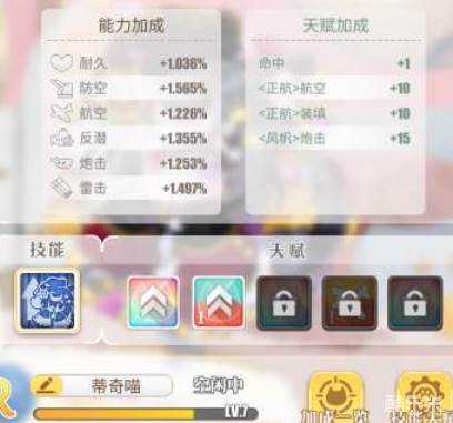 技能方面“未了的传奇”可以提升大炮的炮击属性,所在队伍里有安妮女王的时候,入战可以触发一轮特殊弹幕,一场一次。从技能与天赋来看,可以作为航母队的过渡或者备用猫,与目前顶配航母猫来说有一点差距,优势在于不用洗,节省资源。