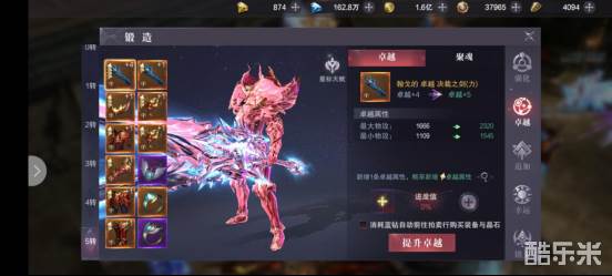 卓越系统是对装备基础属性和卓越属性两个维度进行提升,通过消耗卓越晶石和紫色品质装备进行提升卓越,提升成功会有增长基础属性并激活一条新的卓越属性,如果幸运的激活了星标卓越属性不但能获得强力的卓越属性、还会点亮星标天赋系统进一步获得提升