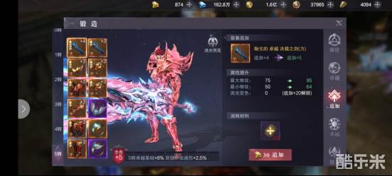 追加系统会百分比提升卓越属性和基础属性,是非常强力的装备养成系统。当追加等级分别达到20级、30级、40级、50级时,还会对装备的流光增加变色效果,让装备流光更加炫酷。