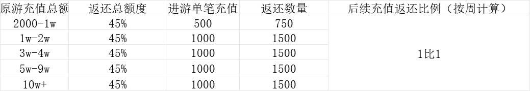 原游充值总额 返还总额度 进游单笔充值 返还数量 后续充值返还比例(按周计算)