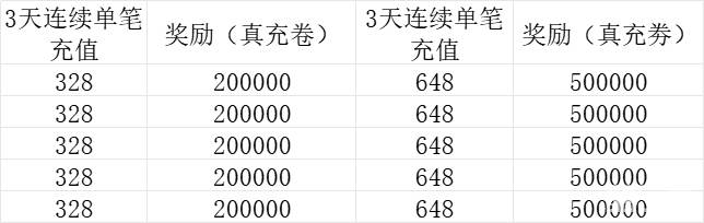 规则:注册角色三天内,每日单笔充值328,返还真充券20W,每日单笔充值648,返还真充券50W,三天内参与上限为3笔。