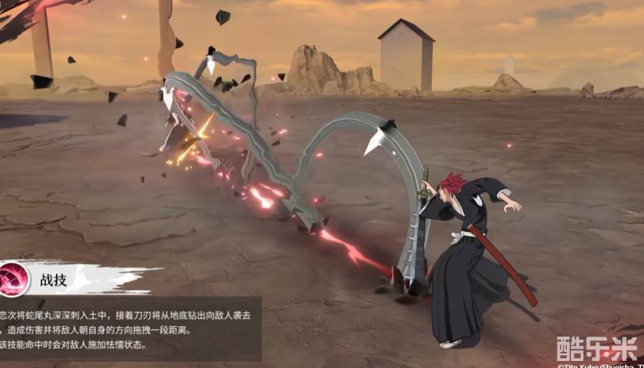 恋次降蛇尾丸深深的刺入土中,接着刺入土中的刀刃将会直接从地底下钻出来并且朝着敌人袭击,造成伤害的同时还能将敌人朝着自身的方向给拖拽一段距离,该技能一旦命中对手也能附加上怯懦的状态。