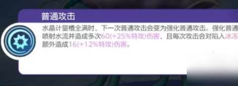 水君的普通攻击看似简单,却充满了巧妙的设计。当它的水晶计量槽积满时,下一次普通攻击将会变成强化普攻,这时水君会开始喷射出水流,造成多次伤害,且如果对方被冰冻状态控制住,那就更有意思了,每一击都会额外附加伤害。这意味着,掌握了水君的强化普攻,你将能够在对战中持续压制敌人,并且一举扭转局势。强化普攻和冰冻效果的结合使水君成为了对敌方强力输出的威胁,尤其是在中期或团战时。