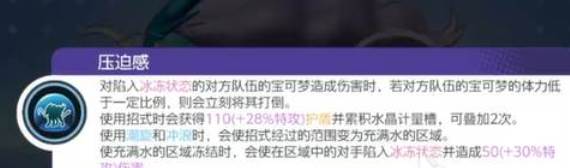 水君的特性“压迫感”,它更是增添了一层致命的威胁。只要敌方宝可梦被冰冻并且其血量低于一定比例,水君就能立即将其击倒,简直是一把无形的剑,时刻悬挂在敌人头上。配合技能的使用,水君还能获得护盾,增强生存能力,十分适合站在战斗的最前线。追击敌人,还是保护队友,水君的特性都能为团队提供很大的帮助。