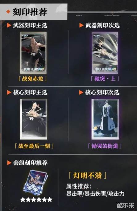 核心刻印肯定要使用能够更加突出角色战斗力的刻印了,那和斑目一角最为匹配的核心刻印就是战至最后一刻,这个刻印能够让斑目一角的所有技能强度都能得到提升,而且自身的暴击伤害也会得到增强,核心刻印次选建议选择恸哭的街道,这个核心刻印虽然是白哉的专属核心刻印,可是若斑目一角没有拿到站至最后一刻的话,恸哭的街道也是一个不错的选择。