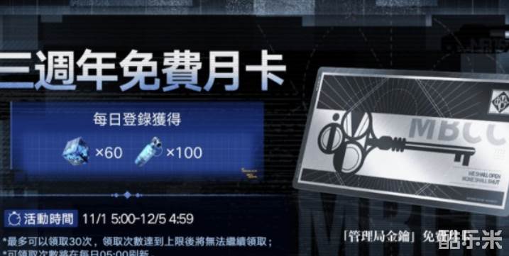 【管理局金钥】三周年免费月卡 (累计领取 1800 异方晶、3000 体力)