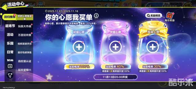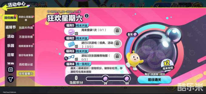蛋仔派对中我们可以在上方寻找到活动按钮,点击即可进入活动中心,这里拥有超级丰富的活动,比如玩具大作战,万圣狂欢夜,以及你的心愿我买单等等,还有很多返场节,小伙伴们都可点击并参与探索。在活动中心回归推荐最下方,就能够寻找到狂欢星期六,点击进入此活动页面,前往通关,即可直接打开相应的游戏模式界面,在周末每天完成两次游戏,比如经典又或者是活动模式,即可成功获得福利。下面和酷乐米小编一起来看看吧