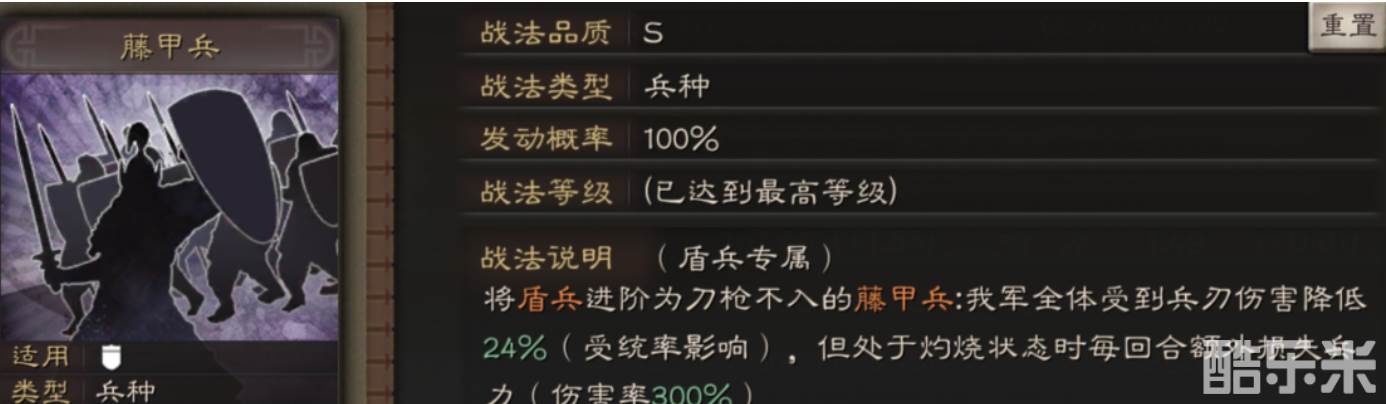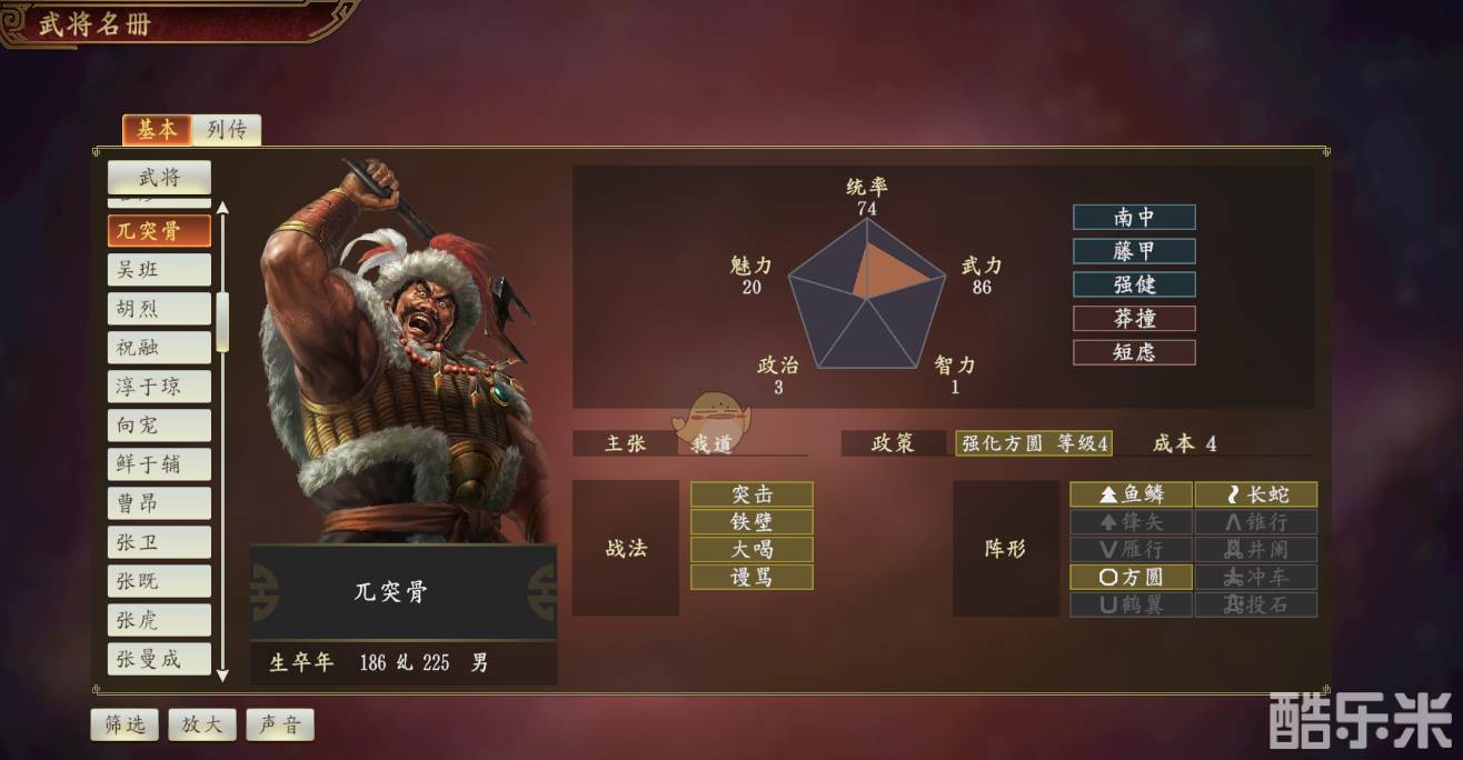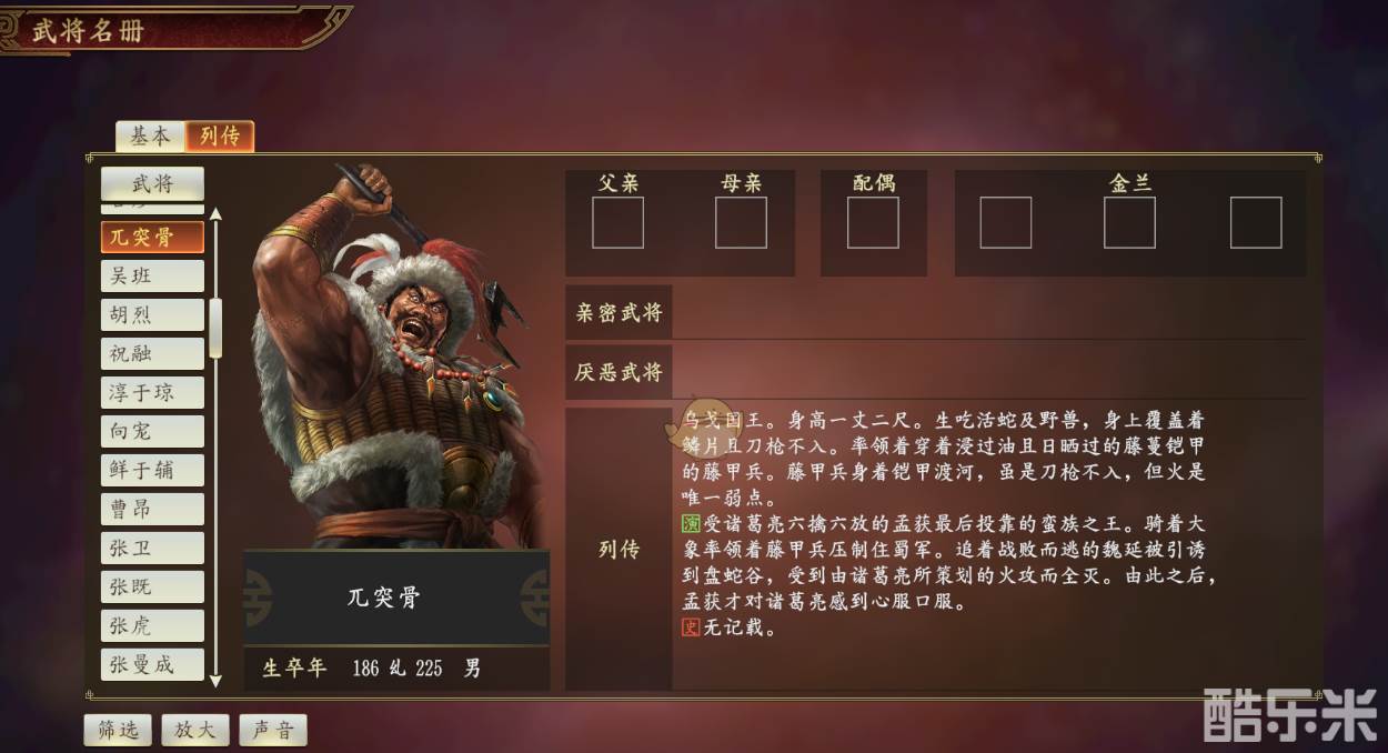 兀突骨统率成长非常高,属于典型的防守型武将。忠诚度为88,兵力基础约8000,所以在持久战中表现很好。更关键的是,他对于盾兵和藤甲兵两个兵种都有S级的适性,尤其是藤甲兵这一特性,在面对物理攻击的时候可以大幅度减少所受到的伤害,可以说是物理队的噩梦。但是藤甲兵也有致命的缺点,就是害怕火攻或者灼烧类的战术。下面和酷乐米小编一起来看看吧