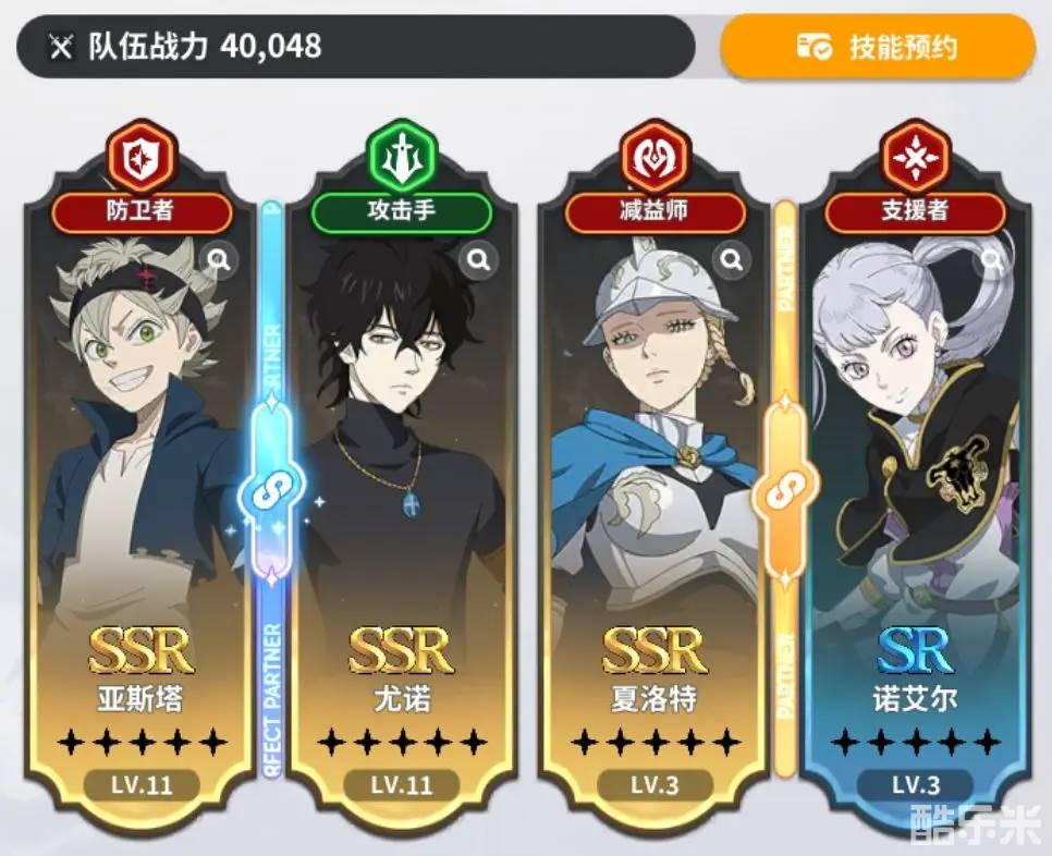 黑色四叶草诺埃尔在游戏前期简直就是万金油一样的存在,这个魔导士不管是放在哪个阵容中都非常的合适,小编这里强烈的推荐大家使用初期最容易成型的阵容,这个阵容需要的角色就是亚斯塔+尤诺+夏洛特+诺埃尔,别看诺埃尔只是sr级别的角色,可是和这些ssr品阶的角色搭配起来,诺埃尔却丝毫不会显得若是,反而显得相当的强势。下面和酷乐米小编一起来看看吧