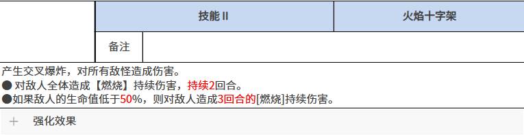 这里的增益是根据友方的生命数值来提高她们魔法上面的强度,这里的话,达到的是80%的提升效果,所以作为一个给敌人带来持续伤害的同时给自身带来团队增益的效果来说,是比较全面的能力,那么她的技能2上面也是利用火焰带来更强大的能力,那么这里使用的火焰效果是技能效果是火焰十字架,在上面实战当中会产生一个交叉爆炸的效果,此时那么覆盖到的敌人是群体的目标,所以算作是一个大范围的群体伤害能力,此时如果对敌人造成这类爆炸输出的话,还有一个额外的机制就是燃烧有一定的概率可以触发。