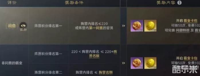 根据占领「霸业建筑」结算阵营部分霸业名额;占领「洛阳」「许昌」的阵营,将会随时间获得大量霸业积分。