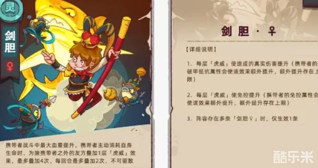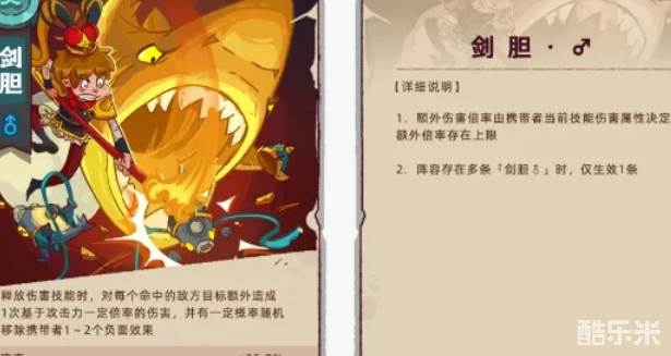 咸鱼之王周年庆版本更新之后,又推出了三条金鱼,“剑胆”是其中之一,这条金鱼公和母提高的特效属性加成有区别,能够搭配不同类型武将,下面和酷乐米小编一起来看看吧