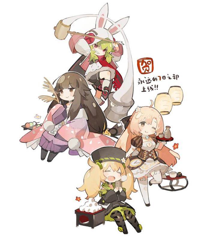 除了陪伴指挥使冒险之外,生活中神器使是怎样的呢?下面的作品里,温柔的学姐安托涅瓦正安静的研究着插花,光荣女仆安为大家奉上热茶,小恶魔艾露比锤制年糕,而一旁的警官妮维开心的捧着热茶,她们欢聚在一起,准备享用美味的年糕。