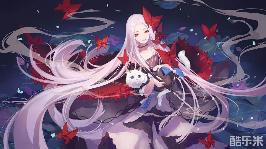 于公测最新开放的、游戏中神秘的角色——霞,白夜馆中的她,闲逸的坐在沙发上,缕缕银丝如瀑布般倾洒开来,身上的红色蝴蝶仿佛下一秒就要起舞,她一手端着烟斗,一手轻抚白猫,嘴角噙着不知名的笑,充满了神秘的气息,想让人一探究竟。