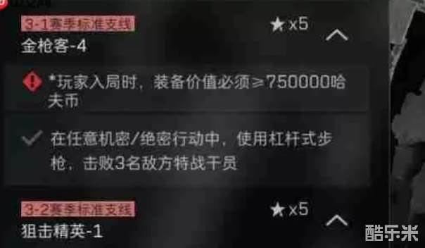 最后编辑于4天前三角洲行动s7赛季3*3第3阶段卡关难题来袭!不少玩家被困在狙击精英与金枪客任务上,进度寸步难行。此阶段除主线外还需累计14颗星,必须从金枪客、狙击精英、鸦影之谜中挑选两项完成;若选择鸦影之谜,则可舍弃金枪客或狙击精英其一,并搭配区域猎手或潜行空间补足任务量。下面和酷乐米小编一起来看看吧