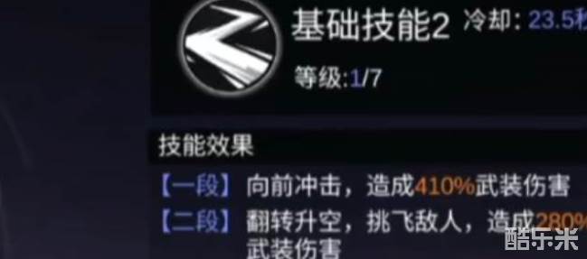 二技能可以让他向前冲刺,造成四倍的武装伤害。到了第二段的话可以回旋升空,并将对手挑飞,可造成高达280%的伤害。第三段就好一瞬间闪现至对手面前,接着发动剑气切割对方,造成更高的爆发伤害。