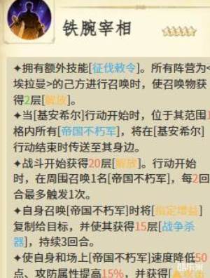 根据基安希尔阵营达到的埃拉曼己方成员带来召唤的时候,就可以让召唤物身上的效果得到足够的解放能力,通过他这样的技能来看的话,只要行动一开始,在他范围之内,一格当中所有的帝国不朽军都会根据他的能力来传送到身边,所以这个角色目前使用的话,其实带来的群体效果是比较好的,基安希尔处于1阶的情况下,可以选择技能有沙海战士以及协防的能力,如果是选择沙海战士技能的话,带来的是被动免疫的效果,在其中可以免疫的能力是对于致盲这类效果的一个免疫,而且在他主动攻击之后,如果敌方正好处于一些土地格子的话,那么此时还会附加10%的攻击效果,在攻击能力上面带来的是穿透类型的伤害,以及根据目前土地属性增加的属性元素伤害,比如说放在沙地格子上的话,那么此时带来的就是沙地属性的攻击能力。