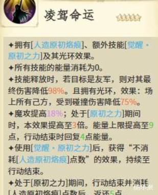 沙娜姿她带来的个性效果是凌驾命运,在这个效果上面可以根据她额外技能以及自身的光环效果带来更多的加成,如果是在她技能释放的时候,利用这个个性效果给她使用技能效果的目标,如果是友军的话,此时还可以对最终的伤害降低98%的能力,而且在她拥有了光环效果之后,场上所有的己方成员受到碰撞的时候,伤害也会降低75%的数值,而在她自身的提高能力上面,是针对于魔攻的18%提升效果,后期如果是处于原初之力的情况下,那么她的效果则会有3倍能力的提升。