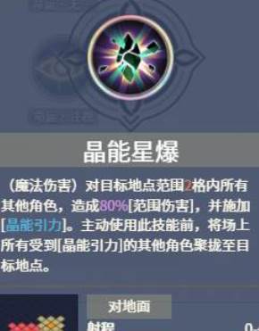 根据这样的能量上限提升效果,她行动结束的时候,自身还会恢复4点能量数值,根据这样的数值恢复她后期获得不消耗原始烙痕的点数效果,也会让她在整个行动回合里面有更多的行动能力,而在技能书效果上面,大家就要注意一切的时候点的能量波跟技能星爆是不太一样的,能量波的魔法攻击只有80%的数值,而技能星爆的话,根据她的魔法伤害,可以对目标地点的范围内,两格之内所有的角色都造成80%范围伤害,并且此时施加的技能也可以带来一定的加成,根据此类效果,她还可以带来一个吸怪的能力,所以在一阶的时候,其实选择技能星爆这个技能会更符合她的能力。