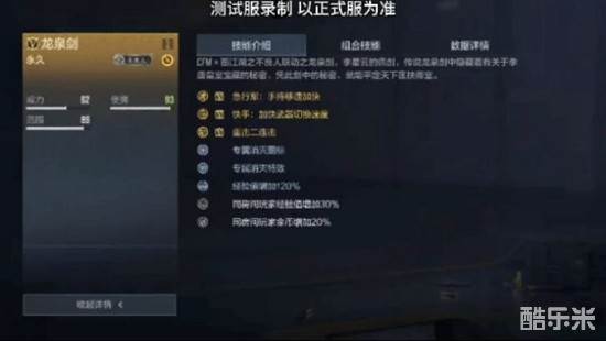龙泉剑拥有急行军:手持移速加快和快手:加快武器切换速度属性。并且拥有专属消灭图标和专属消灭特效。最重要的是这款龙泉剑拥有重击两连击属性,特别是第二段攻击的气经的特效表现完美复刻剧中场景,这条属性在实战中让这款龙泉剑的实力大大提升。