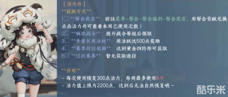 只能够通过使用活力丹来获取一定的活力值,或者是完成日课,每天的日课前三个任务都会给一共三百点活力值。每一瓶活力丹在使用之后会增加三百点活力值,每周使用活力丹的瓶数有上限,最多为六瓶。并且需要注意,如果加上活力丹的三百点活力值之后,此时自身的活力值将会超过上限的话,那么则无法使用活力丹。活力丹的获取方式有限,分为四种获取方式,第一个是帮会商店,在帮会商店里面使用帮贡可以购买到活力丹,每周限购两瓶,需要注意所在帮会要满足帮会等级二级的条件。帮贡的获取则是完成帮会任务中的任意任务就能获取,每周帮会商店的两瓶活力丹是必兑换的。