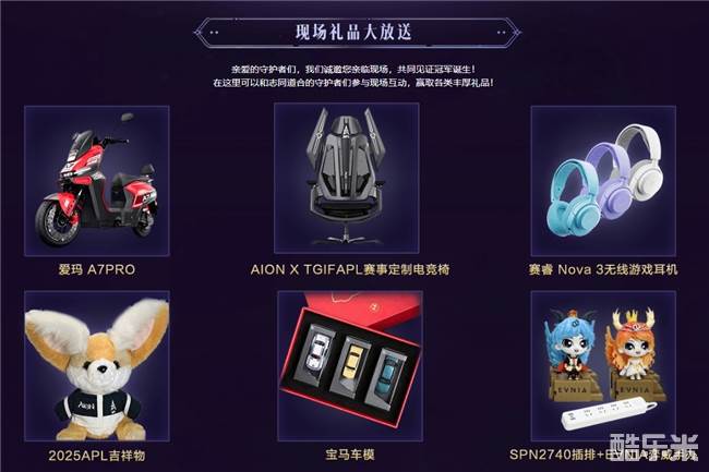 而赛事中最受关注的,莫过于为玩家准备的重重福利。 赛事方联合了多家赞助商,为现场和线上观众打造了一场福利盛宴。在现场,每一位到场的玩家都能获得专属限定伴手礼,包括精美实物联名周边和珍稀游戏道具。更令人惊喜的是,现场观众还能解锁2025APL赛事线下观赛礼包。赛事总冠名商爱玛电动车更是为现场观众准备了重磅福利——“爱玛A7PRO”实物抽奖,不知道谁才是那个幸运儿呢?