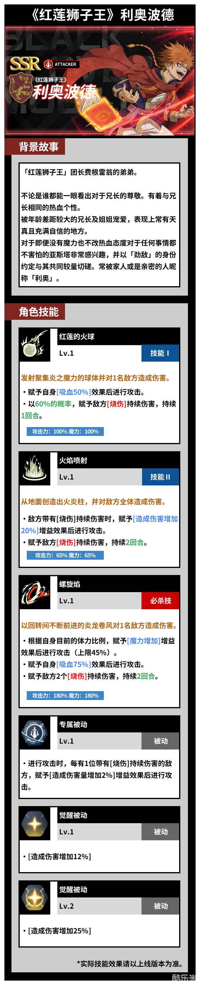 黑色四叶草红莲狮子王利奥波德是「红莲狮子王」团长费根雷翁的弟弟。不论是谁都能一眼看出对于兄长的尊敬。有着与兄长相同的热血个性。下面和酷乐米小编一起来看看吧