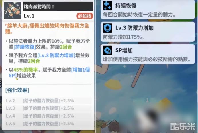 恰米的必杀技“烧烤派对时间”,不仅提供全队治疗,还能提升防御力增益,并有概率让队友获得SP,使队伍在长时间战斗中持续高效输出。技配合觉醒被动和专属被动,恰米还能在盟友回合结束时为生命值最低的队友恢复生命值,并增加自身最大生命值,为队伍提供稳定续航,让战斗打得更轻松和持续。