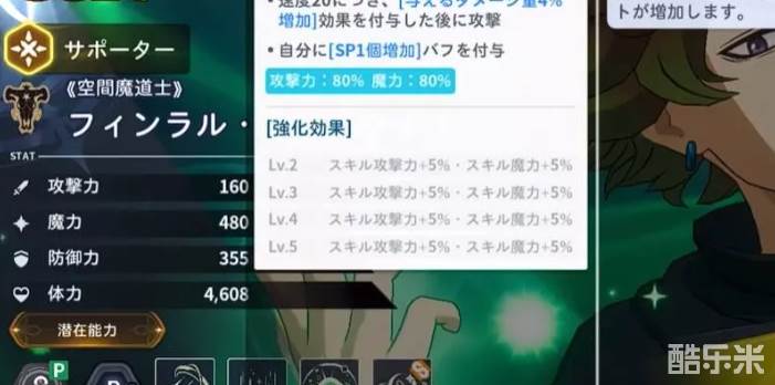 黑色四叶草芬拉尔的基础属性还是比较突出的,攻击力160、魔力480、防御力355、体力4608,典型的高魔力低攻击辅助模板。作为金色黎明团之一,它主打的还是支援型角色,属于ssr级别角色。主要机制是通过空间魔法为队友提供会心伤害加成和速度提升。虽然攻击力较低,但是魔力面板在SSR中属于上游,确保辅助技能效果最大化。下面和酷乐米小编一起来看看吧