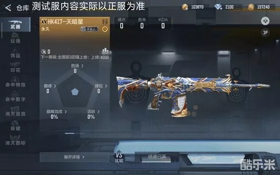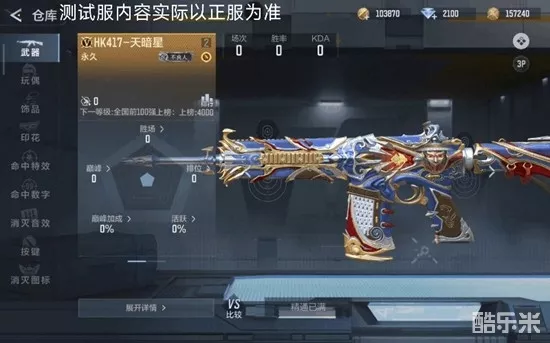 穿越火线:枪战王者HK417-天暗星,以蓝、金、红三色为主调,将古代战甲的元素与现代枪械融合。枪身遍布金色的雕花与镶边,蓝色主调,红色作为点缀,在枪托、握把和弹匣部位形成鲜明对比。最引人注目的是,在枪栓下方的核心位置,巧妙融入了画江湖之不良人中天暗星的形象,那是一张极具辨识度的面具,红瞳怒睁。下面和酷乐米小编一起来看看吧