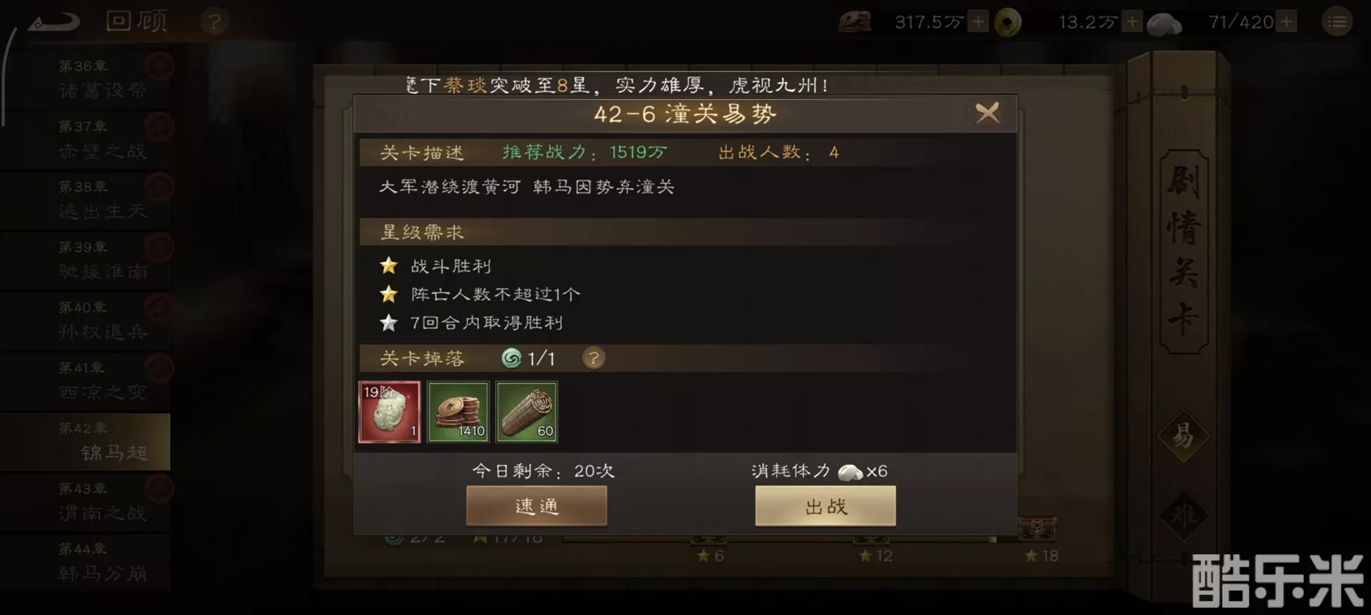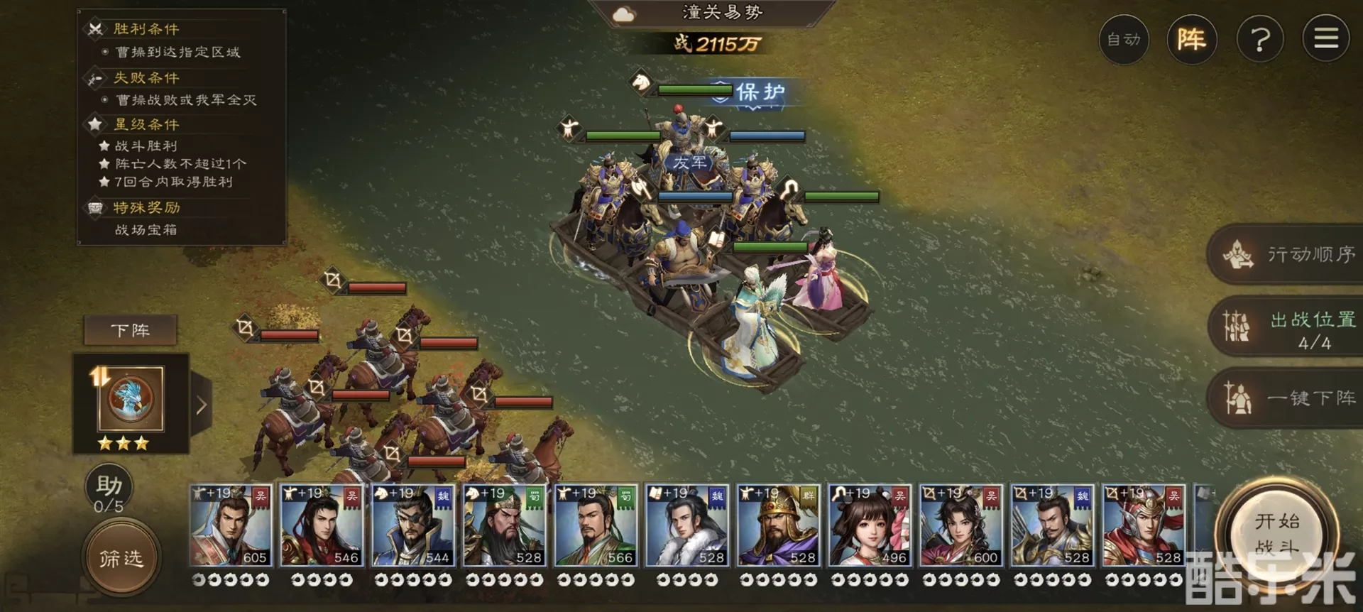 三国曹操传主线42-6需在7回合内护送“保护曹操”抵达右侧高亮区域。推荐携带神兽青鸟(开局+1移动),阵容:曹操、曹洪、貂蝉、诸葛亮。下面和酷乐米小编一起来看看吧