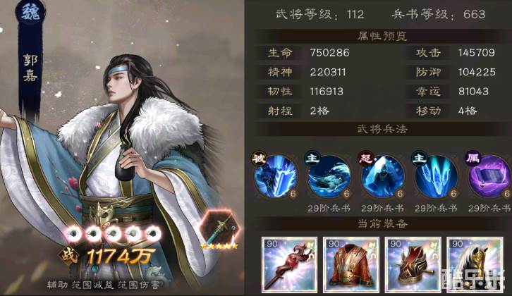 核心天赋「鬼谋」:核心就是减移动力,挂减伤buff,同时移动差越高,输出越高。看到这就知道郭嘉就是老牌魏国流派,和许褚,典韦,刘烨绝配。