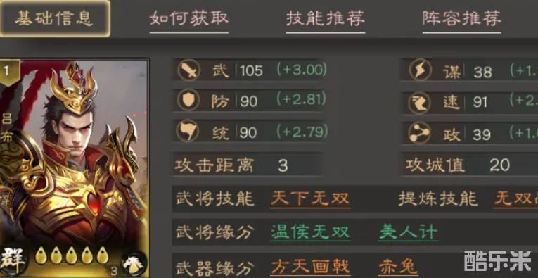 三国乱世霸王吕布是天花板级的兵刃输出——自带战法“天下无双”是定点爆发神技,不仅伤害系数极高,还能无视缴械效果持续输出;同时他的武力、速度属性顶尖,既能快速出手打先手爆发,又能克制依赖主动技能的法师队,是当前版本泛用性与强度兼具的T0输出。下面和酷乐米小编一起来看看吧