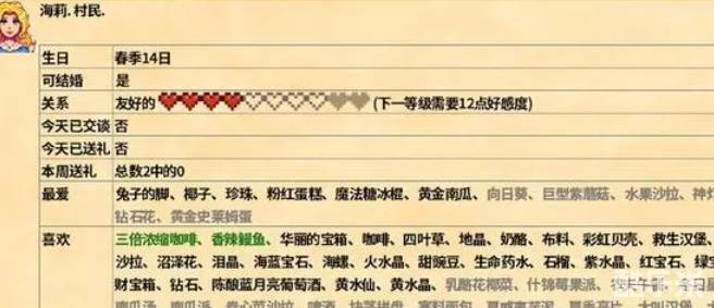 马鲁的喜好食物:马鲁特别喜欢玩家种植的小麦,每次收获小麦时,都可以将一些送给他,这将大大增加他对玩家的好感度。