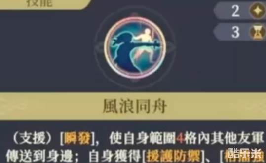 风浪同舟是瞬发支援技能,可以大范围将周围友军传送到身边,自身获得援护防御,格挡强化2(正侧远程攻击必定格挡,额外降低25%伤害),同舟(反击警戒先制后对目标施加禁止被动技能和降低攻击二1回合)