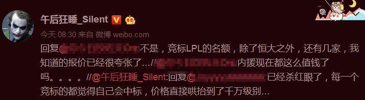 今天知名博主@午后狂睡_Silent再次在微博中爆料:LPL竞标中除了恒大还有几家,已经杀红了眼,价格被哄抬到了千万级别。