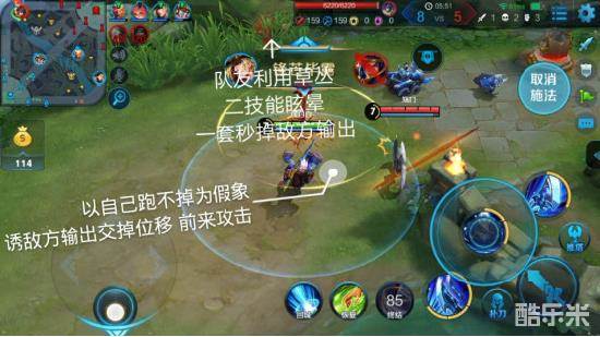 如果附近有草丛的话利用自己引诱对面也是一个不错的套路,让对面以为自己撤不了,引诱敌方交出位移前来攻击。在本局对战中,小白和安琪拉与对面老夫子对战时,老夫子往小白身上套了一个大招,老夫子死了之后,安琪拉躲进草丛,小白以自己还被老夫子的大招控制住为假象,引诱对面李元芳交出位移,前来攻击,配合安琪拉的二技能,击杀李元芳。