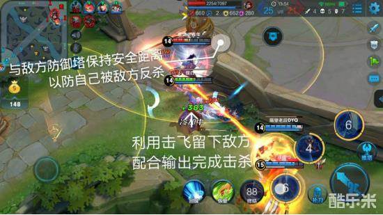 夏侯惇的一技能具有击飞的控制效果,所以有时候我们可以利用一技能击飞并且留下对方,然后配合输出成功击杀对面英雄。在本局对战中,由于是在对面防御塔旁边展开的对战,所以小白与防御塔保持安全距离,防止自己被对面反杀。同时利用一技能击飞留下敌方,然后配合法师和射手完成击杀。