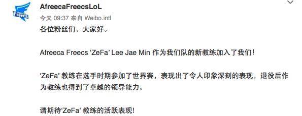 今天LCK赛区的Afreeca战队宣布,前Najin选手,KDM教练ZeFa将成为队伍的新教练。