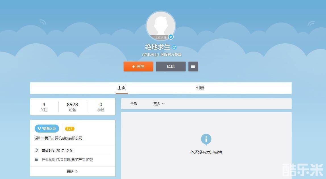 目前该微博还未发布任何信息,不过简介中非常明确地写出了“《绝地求生》国服官方微博”,同时也有企业微博认证,一旁显示为深圳市腾讯计算机系统有限公司。可以确定这就是国服官微了。
