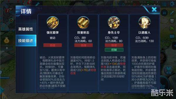 刘备能够提高自身的移动速度并且使下一次的普攻变成连续两次的射击。这个技能是刘备主要的输出手段,能够在开启后瞬间对敌人造成两下的连续攻击从而打出高额的爆发,并且技能附带的加速效果也能够提高刘备的追击能力,同时在逃跑的时候也非常好用。