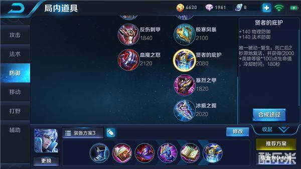 前期选择秘法之靴能够提升诸葛亮的法术穿透和移动速度,间接提升诸葛亮的输出能力和游走能力,而噬神之书是诸葛亮前期的核心装备,提升法术攻击、血量和冷却缩减,被动增强诸葛亮的的法术吸血,增强诸葛亮的续航能力。博学者之怒大幅度提升法术攻击,让诸葛亮在中期具有爆发性的输出。而回响之杖提升法术攻击和移动速度,被动让诸葛亮在技能命中对手时候造成额外的伤害,让诸葛亮打击敌人得心应手。而贤者之书则是提升大幅度提升法术攻击,而被动血量的提升则是直接增强诸葛亮的生存能力。最后选择贤者的庇护能够增强双抗,被动让诸葛亮拥有复活一次的机会,提升诸葛亮的续航性。