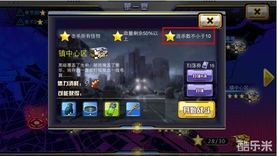 天天的小伙伴们,咱们又见面了~ 话说改版之后,三星评价变了花样,不再是之前版本的由过关剩余血量这一单一数据来判定星级,而是不同的关卡有不同的三星条件,必须同时达到这三个条件才能获得三星评价!小编我是个有强迫症的人,看着那灰色的星星就有抓狂的赶脚有木有~~三星条件有的是硬卡,比如多少多少时间内通关,小编只能说:“努力升级强化装备提高战力或者像土豪一样抽把牛X的枪支然后碾压关卡吧!”但是有的三星条件就是技巧型的,比如-----连杀!