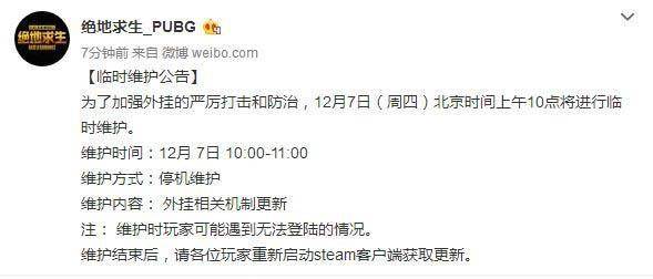 为了加强外挂的严厉打击和防治,12月7日(周四)北京时间上午10点将进行临时维护。